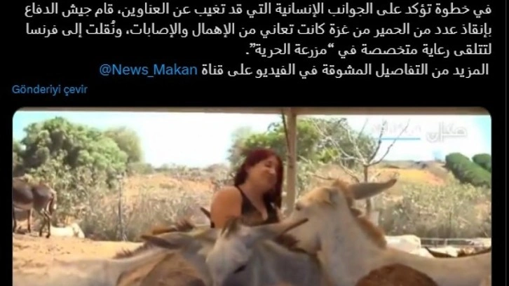 Paylaşımda, "İsrail, Gazze'den eşekleri kurtararak insanca bakım için Fransa'ya nakletti." ifadesine yer verildi.