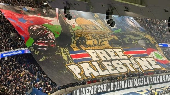 Fransa'nın başkenti Paris'te oynanan karşılaşma öncesi PSG taraftarları "Özgür Filistin" pankartı açtı.