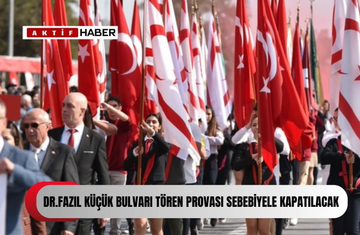 Polis Basın Subaylığı'ndan yapılan açıklamada, Dr. Fazıl Küçük Bulvarı’nın Gönyeli Çemberi ile Honda yanındaki trafik ışıkları kavşağı arasında kalan güzergahının, saat 07.00’den itibaren, tören provasının sona ereceği saate kadar trafik akışına kapalı olacağı bildirildi.