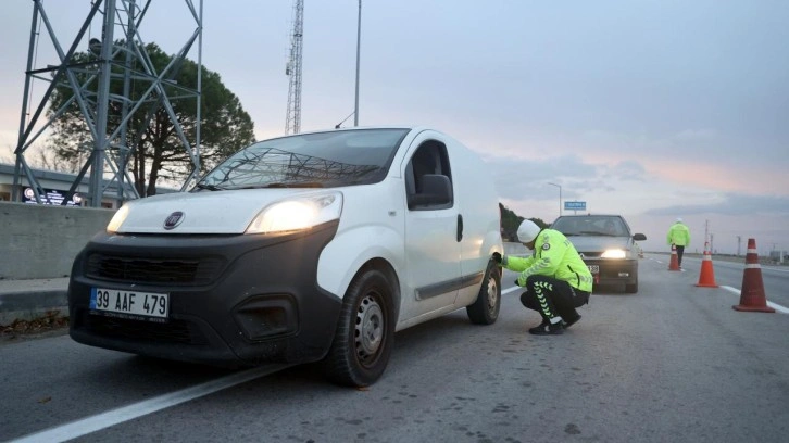 Kırklareli Emniyet Müdürlüğü Bölge Trafik Denetleme Şubesi ekipleri, kentin giriş ve çı kış noktalarında ticari araçların kış lastiklerini kontrol etti.