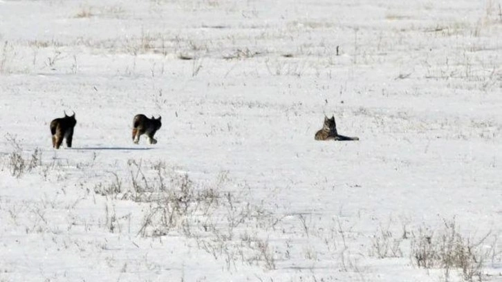 Bölgede etkili olan kar yağışı sonrası doğada yiyecek bulmakta zorlanan vaşak ailesinin köy kırsalına kadar indiği görüldü. Bir süre kar üzerinde ilerleyen vaşaklar, daha sonra gözden kayboldu.