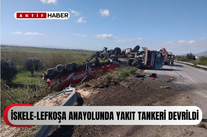 Polis Basın Subaylığı’ndan yapılan açıklamaya göre, bugün saat 10.45 sıralarında Ahmet Karaaslan (E-50), yönetimindeki LL 239 plakalı yakıt tankeriyle İskele-Lefkoşa ana yolunda Lefkoşa istikametine seyrettiği sırada dikkatsizliği ve ihmalkârlığı sonucu direksiyon hakimiyetini kaybedip, yoldan çıkarak tankeri devirdi.