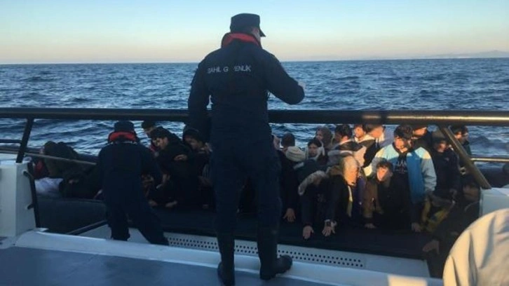 Bölgeye yönlendirilen ekipler, hareketli lastik bottaki 59 düzensiz göçmeni yakaladı.