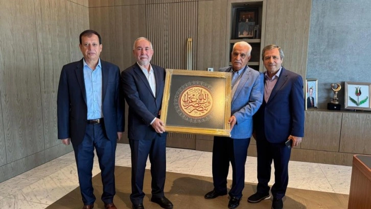 Karaman, Çelik ve Karahan, Tanyeri’ne Âl-i İmrân Suresi 160. ayetin bir kısmının yer aldığı bir hat tablosu hediye etti.