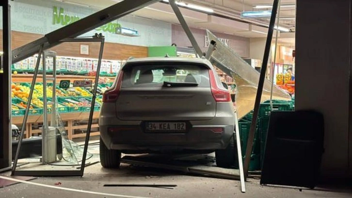 S.A. yönetimindeki 34 KEA 182 plakalı cip, otoparktan çıkmak için sürücüsünün manevra yaptığı sırada, kontrolden çıkarak zincir markete daldı.