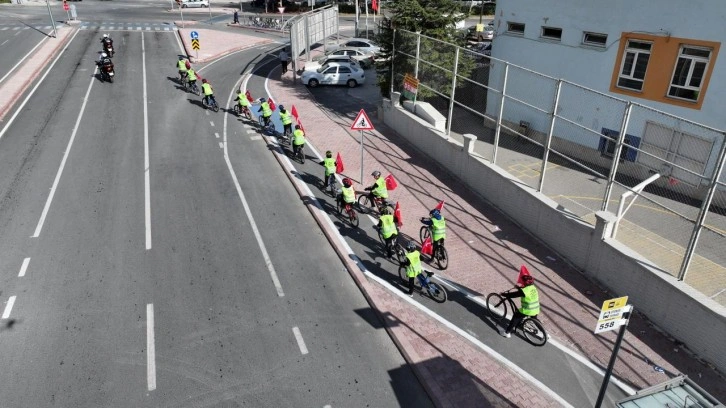 Konya Büyükşehir Belediyesi Zabıta birimlerinin ve öğretmenlerin eşlik ettiği sürüş esnasında öğrenciler, bisikletlerinin gidonlarına bağladıkları bayraklarla belirlenen güzergah boyunca pedal çevirdi.