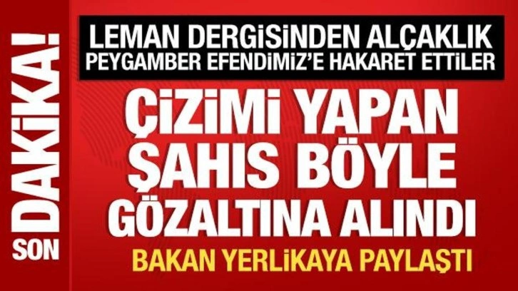 Bakan Yerlikaya, çizimi yapan şahsın gözaltına alınma anlarını paylaşarak, "Peygamber Efendimizin (S.A.V) karikatürünü yaparak nifak tohumları ekmeye çalışanları bir kez daha lanetliyorum. Bu alçak çizimi yapan D.P. adlı şahıs yakalanarak gözaltına alınmıştır. Bir kez daha yineliyorum: Bu hayasızlar hukuk önünde hesap verecektir." dedi.