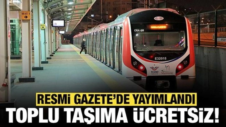 Son dakika haberi: Resmi Gazete'de yayımlanan karara göre, 23 Nisan Ulusal Egemenlik ve Çocuk Bayramı nedeniyle, bugün Başkentray, Marmaray, İZBAN, Sirkeci-Kazlıçeşme Raylı Sistem Hattı, Gayrettepe-İstanbul Havalimanı-Arnavutköy Metro Hattı seferleri ile belediyeler ve bunların kurdukları birlik, müessese ve işletmelerce yürütülen toplu taşıma hizmetleri ücretsiz olacak.
