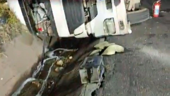 Sürücüsü belirlenemeyen 63 AID 333 plakalı akar yakıt tankeri, direksiyon hakimiyetinin kaybedilmesi sonucunda yola devrildi.