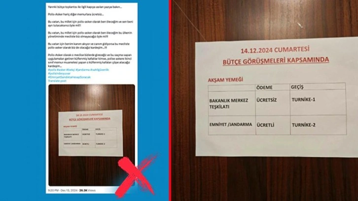 TBMM'nin sosyal medya hesabından yapılan açıklamada, "Bazı sosyal medya hesaplarında TBMM'de gerçekleştirilen bütçe görüşmeleri esnasında akşam yemeğinin bakanlık merkez teşkilatına ‘ücretsiz', emniyet ve jandarma teşkilatı mensuplarına ‘ ücretli' olduğuna dair yapılan paylaşımlar tamamen yalandır.