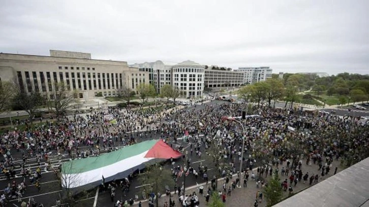 Yapılan konuşmalardan sonra dev bir Filistin bayrağı taşıyan göstericiler, başkentteki ICE genel merkezi önüne yürüdü.