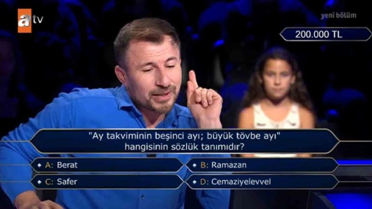 Ekranların sevilen yarışma programı Kim Milyoner Olmak İster, yeni ve heyecanlı bölümleriyle devam ediyor. Milyoner yarışmasındaki 200 bin TL değerindeki soru ise vatandaşlar tarafından merak ediliyor. Peki "Ay takviminin beşinci ayı, büyük tövbe ayı hangisidir?" sorusunun cevabı ne? Yarışmacı Mahmut Bozkır bu soruyu doğru bilebildi mi?