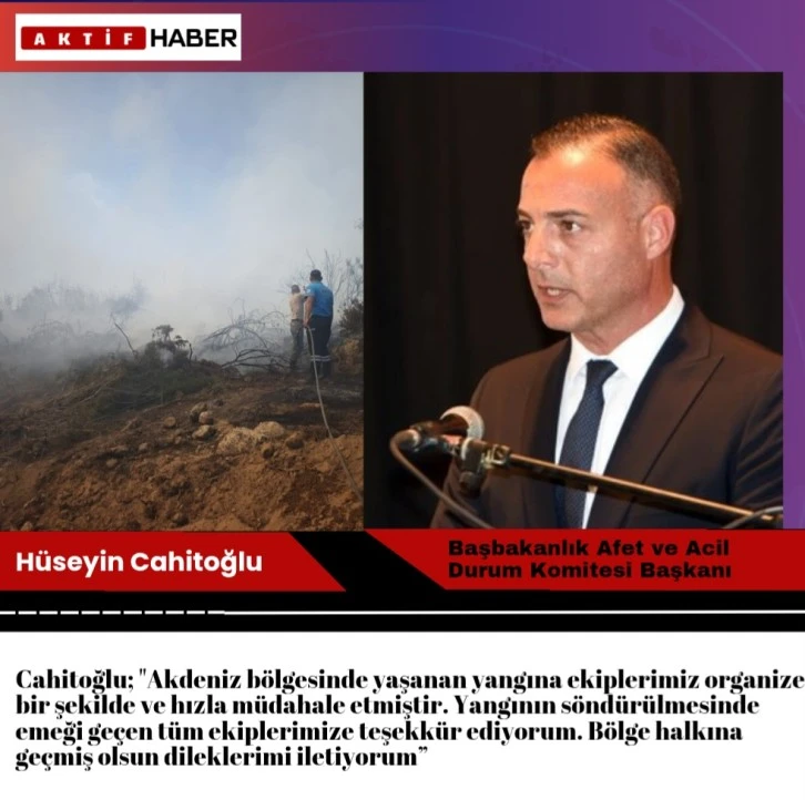 Cahitoğlu; "Akdeniz bölgesinde yaşanan yangına ekiplerimiz organize bir şekilde ve hızla müdahale etmiştir. Yangının söndürülmesinde emeği geçen tüm ekiplerimize teşekkür ediyorum. Bölge halkına geçmiş olsun dileklerimi iletiyorum” dedi.
