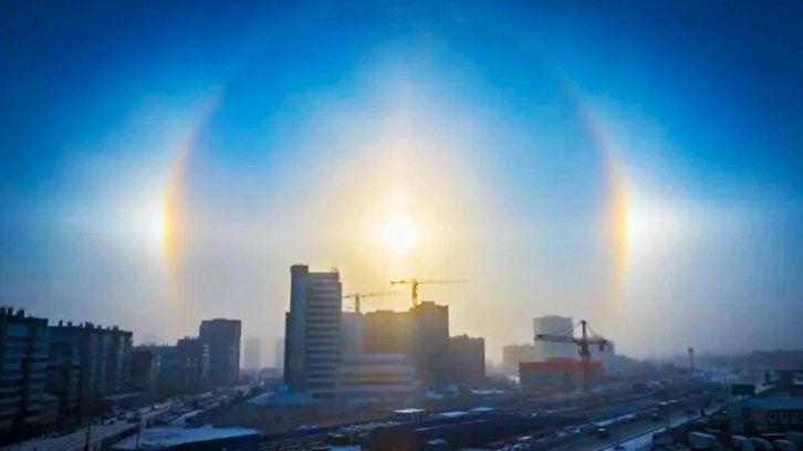 Rusya'nın Krasnoyarsk kentinde, hava sıcaklığının eksi 30 dereceye kadar düştüğü sırada nadir görülen bir atmosfer olayı olan "halo" gözlemlendi. Halo, bir ışık kaynağının etrafında ikincil bir parıltı şeklinde beliren optik bir olay olarak biliniyor. Genellikle Güneş veya Ay çevresinde görülen bu olay, sokak lambası gibi güçlü ışık kaynaklarının etrafında da ortaya çıkabiliyor.