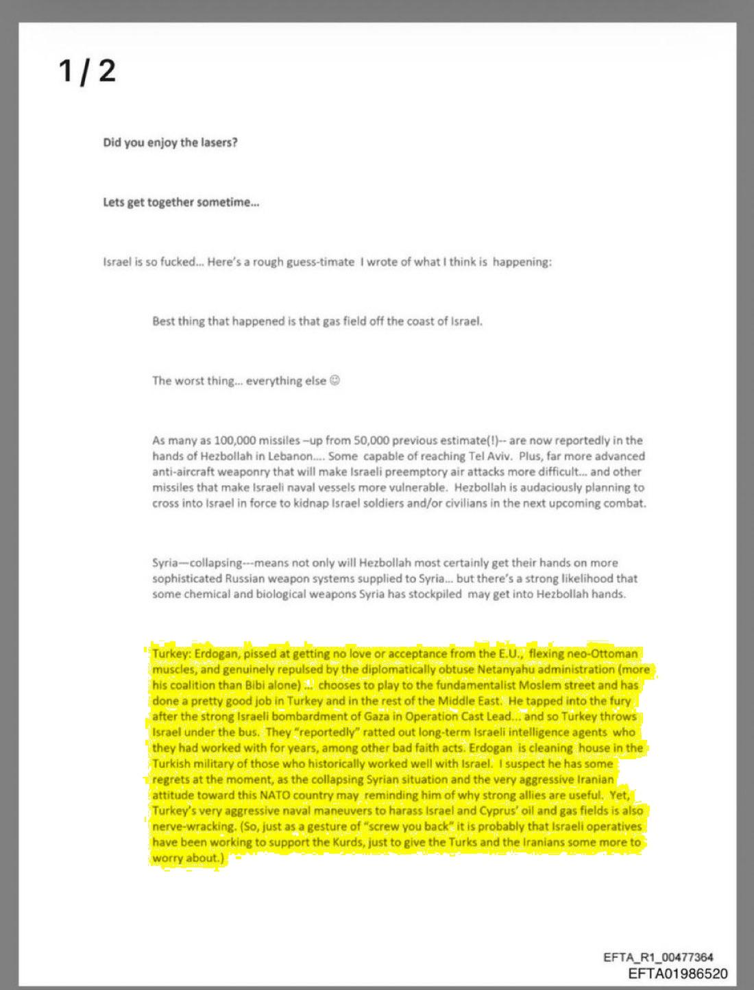 “Türkiye: Erdoğan, AB'den sevgi veya kabul görmediği için öfkeli, neo-Osmanlı kaslarını sergiliyor ve diplomatik olarak anlayışsız Netanyahu yönetiminden (Bibi'den ziyade koalisyonundan) gerçekten tiksiniyor... Köktendinci Müslüman sokağına oynamayı seçiyor ve Türkiye'de ve Orta Doğu'nun geri kalanında oldukça iyi bir iş çıkardı. Dökme Kurşun Operasyonu’ndaki (İsrail’in 27 Aralık 2008-18 Ocak 2009 tarihleri arasında Gazze Şeridi’ne düzenlediği terör saldırılarına verilen isim) şiddetli İsrail Gazze bombardımanından sonraki öfkeyi kullandı ve böylece Türkiye İsrail’i yarı yolda bırakıyor. Diğer kötü niyetli eylemlerin yanı sıra, yıllardır birlikte çalıştıkları uzun süreli İsrail istihbarat ajanlarını "bildirildiğine göre" ele verdiler.”