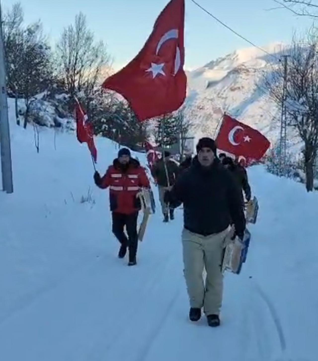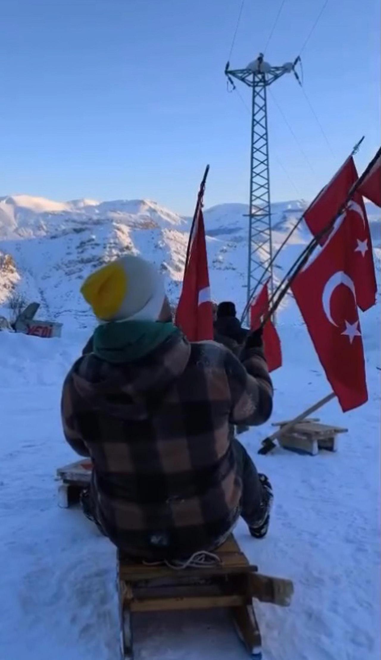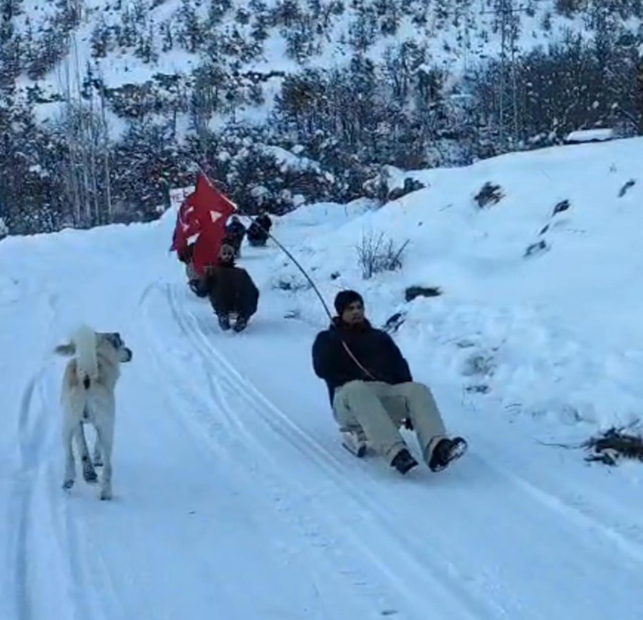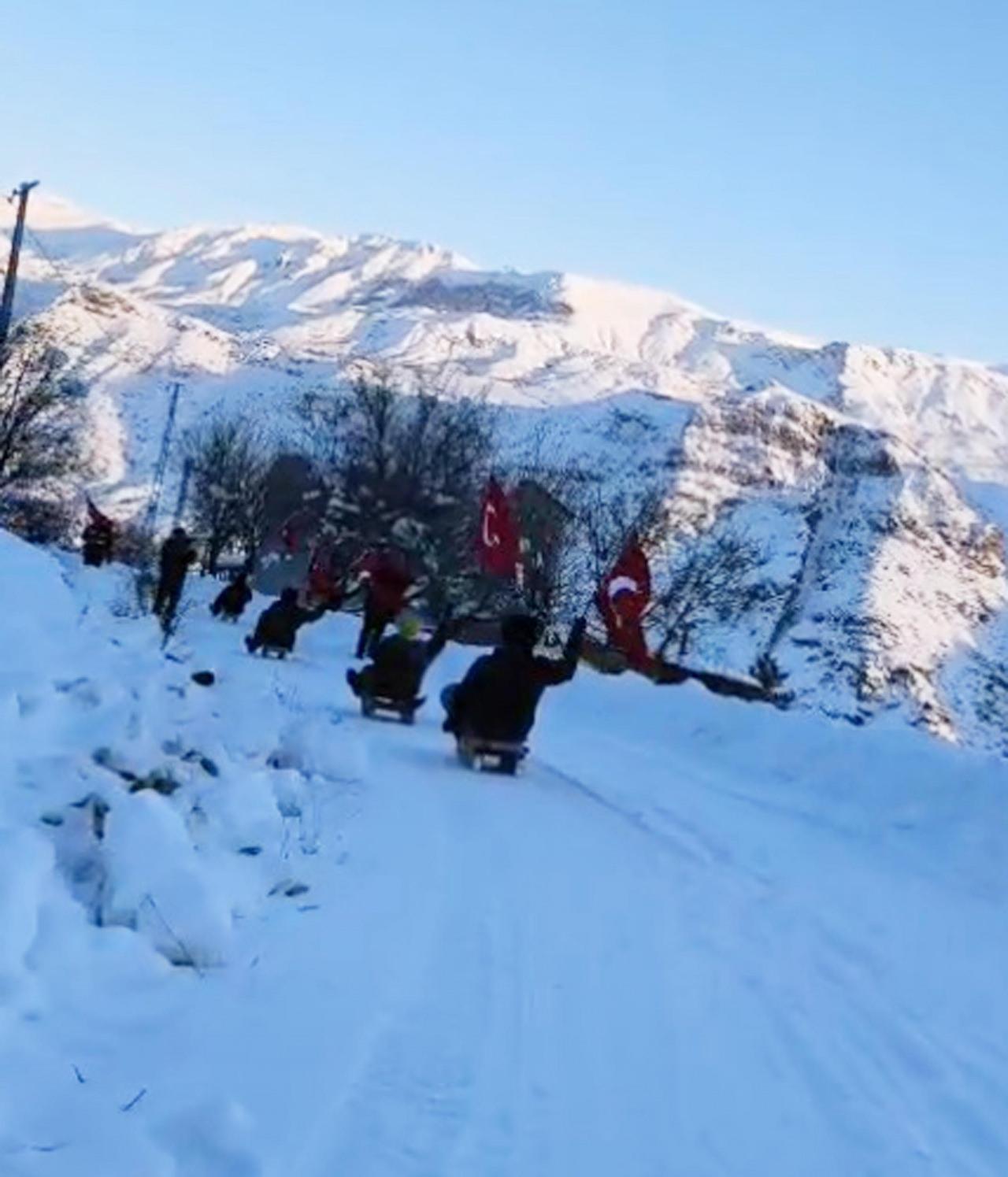 Ellerindeki bayraklarla bölgedeki tepeye tırmanan gençler, burada İstiklal Marşı okuyup, saygı duruşunda buldu. Türk bayrağını da göndere çeken grup, daha sonra yanlarında getirdikleri kızaklarla kaydı.