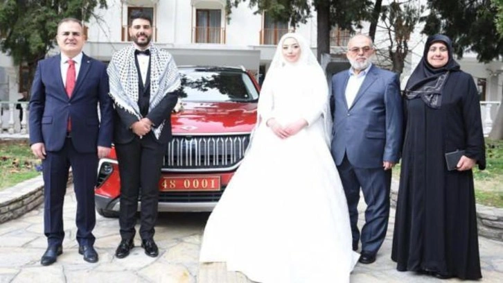 Gazze'de ateşkes kararı sonrası evlenmeye karar veren çifte gelin arabası olarak Vali Akbıyık makam aracı TOGG'u gelin arabası olarak tahsis etti.