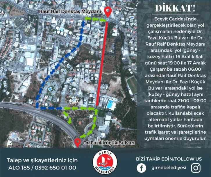 Belediyeden yapılan açıklamada, aynı tarihlerde, Rauf Raif Denktaş Meydanı ile Dr. Fazıl Küçük Bulvarı arasındaki yolun kuzey – güney hattının ise 21.00 – 06.00 saatleri arasında araç geçişine kapatılacağı duyuruldu.