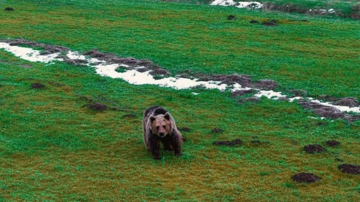 Dağlık ve ormanlık alandan inip yeni yeni yeşermeye başlayan açık arazide yiyecek arayan ayı, görüntü yönetmeni Muhammed Kösen tarafından dronuyle görüntülendi.