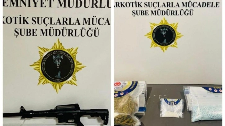 Yapılan aramalarda; bin 220 adet sentetik ecza, 980 adet captagon hap, 454 gram skunk, 6,61 gram kokain, 1 adet ruhsatsız pompalı tüfek ve 14 adet kartuş ele geçirildi.