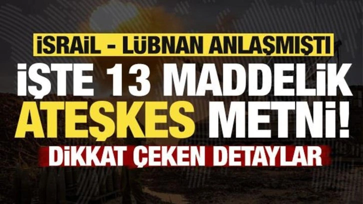 Son dakika haberi... Lübnan ile İsrail arasında yürürlüğe giren 13 maddelik ateşkes anlaşmasına göre, Hizbullah ve Lübnan topraklarında bulunan diğer tüm silahlı gruplar, İsrail'e karşı herhangi bir eylemde bulunmayacak, buna karşılık İsrail Lübnan'a herhangi bir askeri saldırı düzenlemeyecek.
