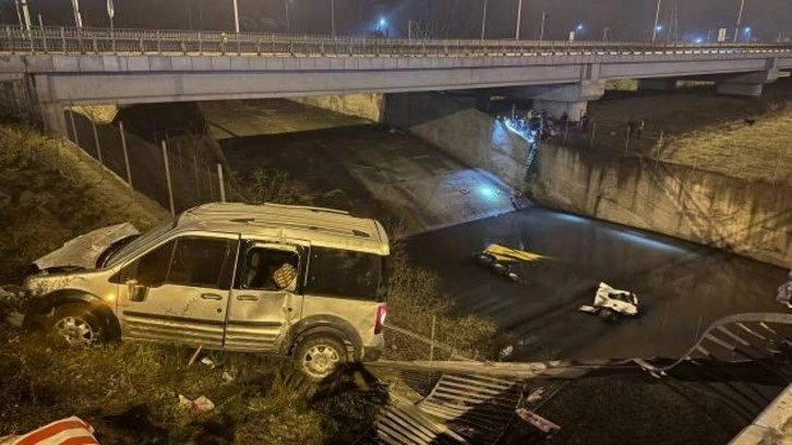 Çarpışmanın etkisiyle bariyerleri aşan iki araçtan kamyon Alibey Deresi'ne düştü, hafif ticari araç ise otluk alanda durdu.